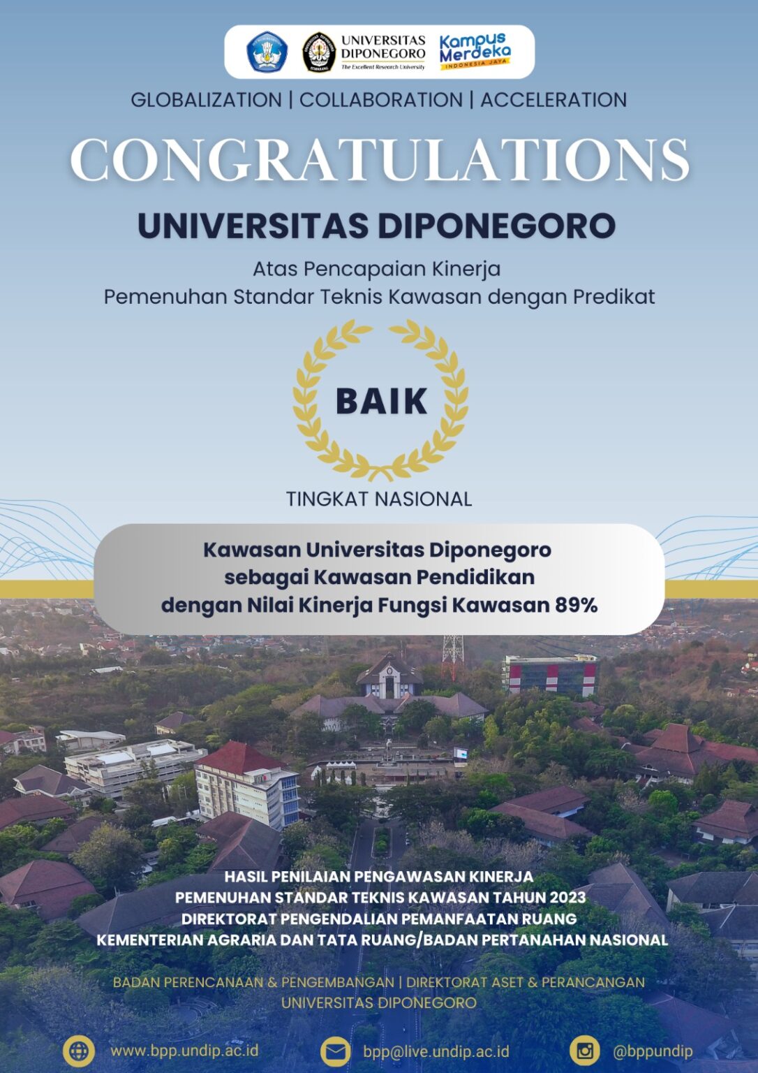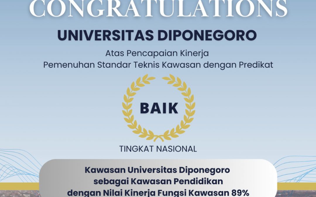 Semarang – Jawa Tengah (11/7). Universitas Diponegoro (UNDIP) kembali meraih prestasi yang membanggakan. UNDIP berhasil memperoleh predikat Baik Tingkat Nasional pada Hasil Penilaian Pengawasan Kinerja Pemenuhan Standar Teknis Kawasan Tahun 2023 Direktorat Pengendalian Pemanfaatan Ruang Kementerian Agraria dan Tata Ruang/Badan Pertanahan Nasional.